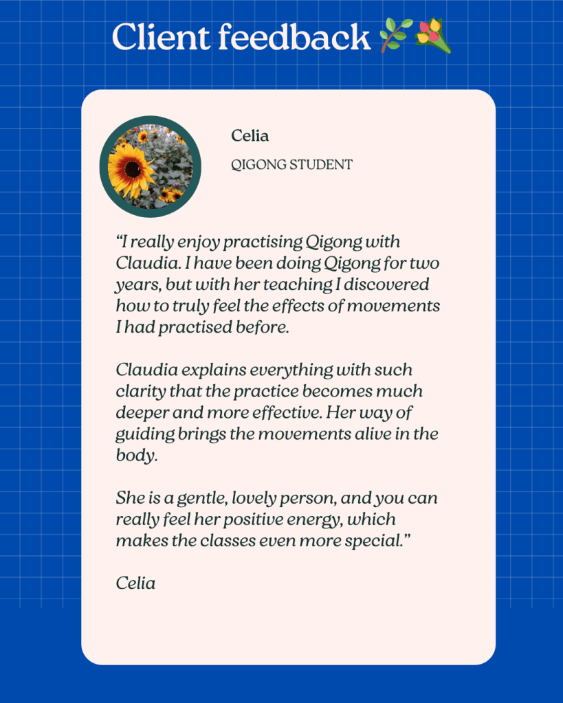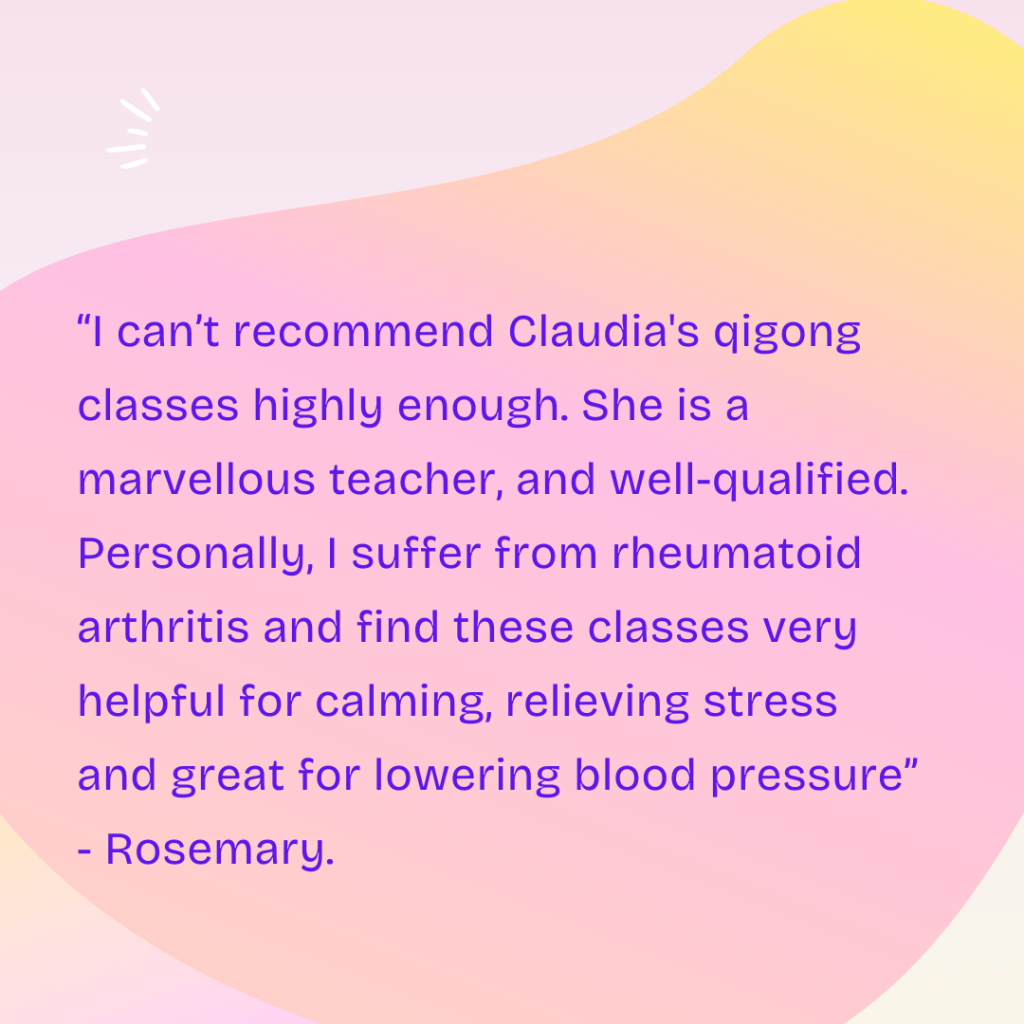 “Attending Claudia’s qigong class is an absolute treat for the mind, body and spirit. She holds space beautifully with lovely visualisations and breathing whilst encouraging movement to the best of everyone’s abilities.